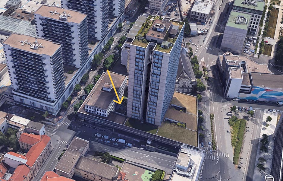 Le bâtiment B se trouve derrière la grande tour Joffre.